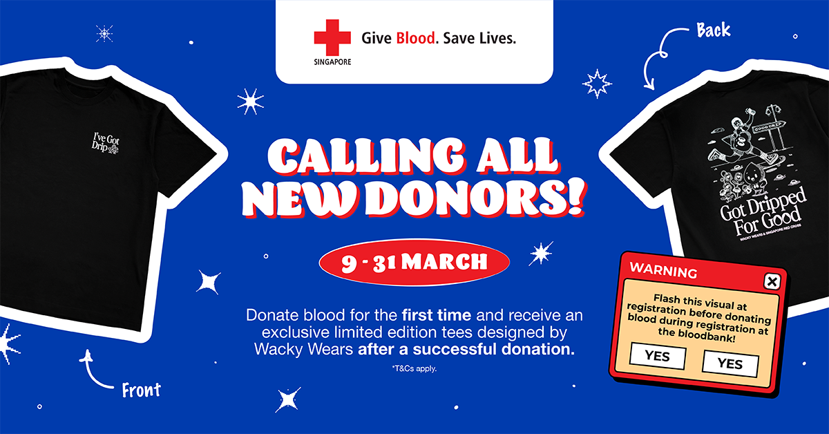 The Singapore Red Cross x Wacky Wears Oversized T-shirt is officially back by popular demand! Thinking of donating blood for the first time? Now is the perfect time. Step up, save lives and score the exclusive t-shirt — because doing good should look good too.